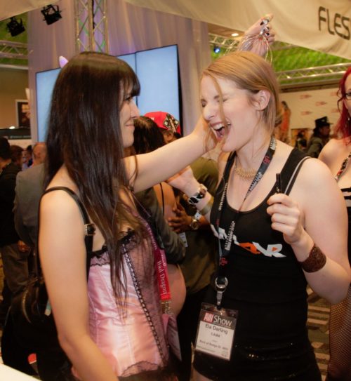 Jelena Jensen intervista Kayden Kross nello stand Fleshlight, insieme a Teagan Presley e Tasha Reign.